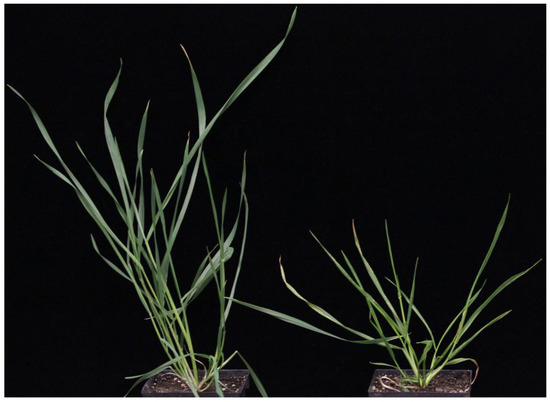 WDIV-infected Sonalika (left) and WL711 (right) wheat plants. Both plants are of the same age. The picture was taken at 21 days post infection.
