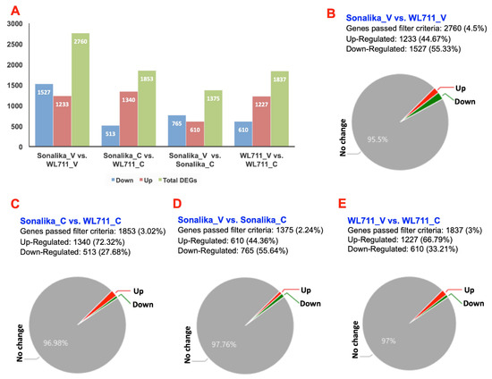 Differentially expressed transcripts. Panel (A) shows total number of differentially expressed transcripts (shown in green), up- (red) and down- (blue) regulated transcripts in different conditions (Sonalika_V vs. WL711_V, Sonalika_C vs. WL711_C, Sonalika_V vs. Sonalika_C and WL711_V vs. WL711_C). Panels (B–E) show percentage of genes that are differentially expressed in different conditions. Sonalika_V and WL711_V are virus-infected Sonalika and WL711 plants and the Sonalika_C and WL711_C are mock-inoculated control plants.