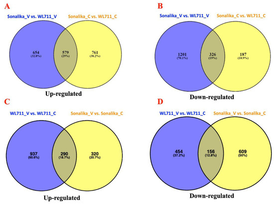 Venn diagram showing total number of up- and down-regulated transcripts (≥2-fold change; p ≤ 0.01) in virus-infected (Sonalika_V vs. WL711_V) and control (Sonalika_C vs. WL711_C) conditions (A,B) and WL711_V vs. WL711_C and Sonalika_V vs. Sonalika_C (C,D).