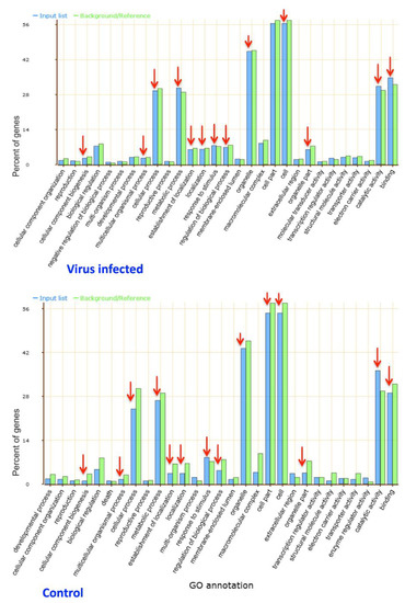 Bar graph representation of enrichment of gene ontology (GO) term for genes differentially expressed in mock-inoculated control and virus-infected Sonalika as compared to WL711. The X-axis represents GO annotation for predicted functions of the genes and the Y-axis shows percent of genes for each function. The green bars represent number of genes in reference list, whereas the blue bars represent the number of genes in the input list. Red arrows indicate the differences in percentage of genes in each functional category between the virus-infected and control samples.