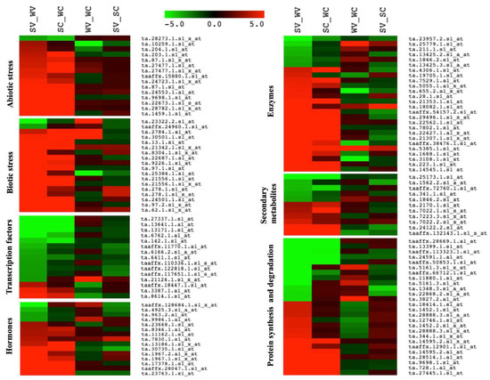 Heat maps of the significant transcripts involved in stress, transcription factors, hormone metabolism, enzymes, secondary metabolism, and protein synthesis and degradation. Transcripts with ≥5-fold change from SV vs. WV condition were used. Fold change of the same transcripts in other conditions (SC vs. WC, SV vs. SC and WV vs. WC) are compared. (SV) Sonalika infected with virus, (WV) WL711 infected with virus, (SC) mock-inoculated Sonalika and (WC) mock-inoculated WL711.