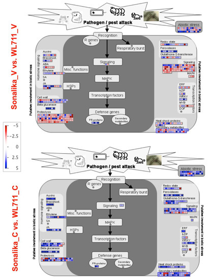 MapMan overview showing differentially expressed transcripts related to biotic and abiotic stress in Sonalika (Sonalika_V vs. WL711_V and Sonalika_C vs. WL711_C). Upregulated genes are shown by light to deep blue color boxes and the downregulated genes are shown by light to deep red color boxes. Color intensities show the level of expressions as indicated by the intensity bar on left. Genes involved in same functions are clubbed together. The transcripts with ≥2-fold change were used for the analysis.