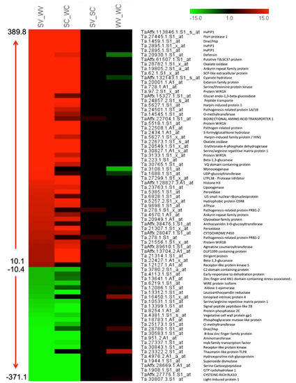 A heat-map of the transcripts ≥10 folds up- and down-regulated in SV vs. WV condition and their expression values in other conditions (SC vs. WC, SV vs. SC and WV vs. WC). Predicted functions of the transcripts are shown next to their probe IDs. (SV) Sonalika infected with virus, (WV) WL711 infected with virus, (SC) mock-inoculated Sonalika, and (WC) mock-inoculated WL711.