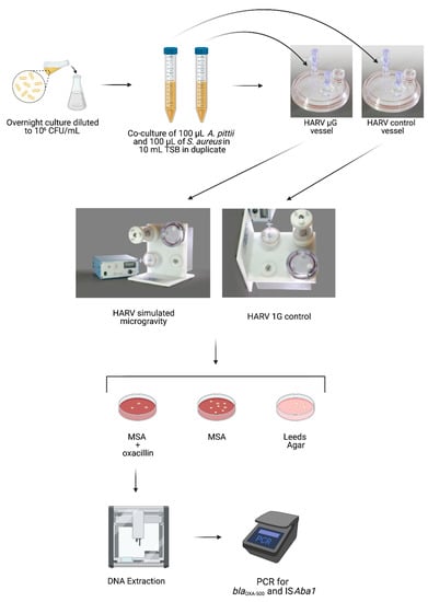 To compare HGT potential between SMG and 1G, co-cultures of A. pittii (donor strain) and S. aureus (recipient strain) were grown in the HARV under SMG (vertical rotation) or 1G (horizontal rotation) for 20 h, after which the culture was plated on mannitol salt agar (MSA) to select for S. aureus. The MSA was also supplemented with oxacillin to select only those S. aureus colonies that had acquired resistance to the antibiotic. To verify that this newly acquired resistance to oxacillin was not due to spontaneous mutations but rather through the HGT of blaOXA-500 and ISAba1 from A. pittii, the S. aureus colonies that grew on MSA supplemented with oxacillin were picked for PCR analysis. A schematic of the experimental set-up is shown in Figure 1.