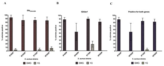 Comparison of HGT activity between SMG and 1G. Four strains of S. aureus (IF4SW, IIF6SW, IF7SW, IIF8SW) were used as the recipient and were co-cultured (separately) with the donor strain A. pittii for 20 h at 37 °C under SMG or 1G conditions. Cultures were plated on MSA containing 4 µg/mL of oxacillin. Colonies that grew were picked, subjected to DNA extraction and then analyzed by PCR with primers specific to blaOXA-500 and ISAba1 from the donor strain. The graphs show the percent of S. aureus colonies, from each strain, that grew on MSA+ oxacillin that had acquired (A) blaOXA-500, (B) ISAba1 or (C) both genes from the donor A. pittii.