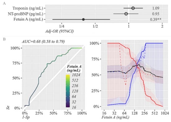 (A). Multivariate logistic regression for the adjusted odds ratio of incomplete STR predicted by Fetuin-A, NT-proBNP and Troponin (log2 transformed). p-value code ** means p < 0.01 (p-0.002). (B). ROC curve showing the prognostic sensitivity and specificity of Fetuin-A with regard to STR at 24 h after successful PCI. The AUC of Fetuin-A (0.68, 95% CI 0.58–0.79) with the optimal cut-off value of 175 ng/mL, which provided Se = 74% and Sp = 61.1% for incomplete STR. The corresponding NPV and PPV were 73.3% and 62% (black line—plasma levels of the biomarker, Se—blue line, Sp—red line, blue dashed lines–NPV, red dashed lines–PPV). AUC, area under the curve; NPV, negative predictive value; PPV, positive predictive value; OR, odds ratio; ROC, receiver operating curves; Se, sensitivity; Sp, specificity; STR, ST-segment resolution.