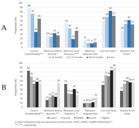 The statistical precision of all prevalence and mean estimates were assessed using 95% confidence limits, which were calculated accounting for the complex sampling. For dichotomous or categorical data, the chi-square test was applied. To compare the difference between means, the t-test was used. Stata’s nptrend command was used to identify nonparametric trends in the prevalence of complementary feeding indicators by age group and wealth quintile [31].