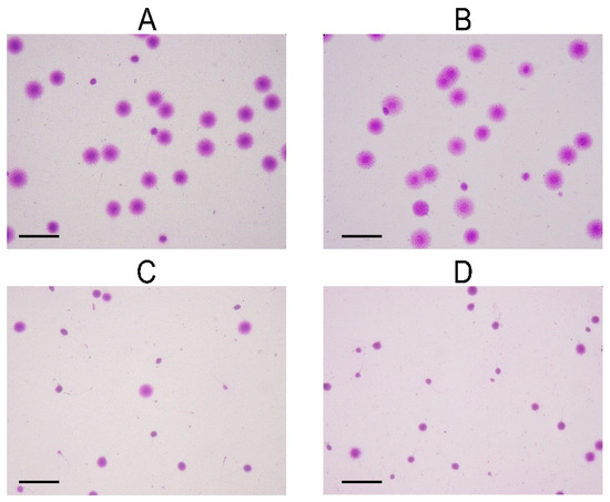 Representative microscopic image of sperm after Halosperm assay for evaluation of DNA fragmentation. (A,B) Non-fragmented sperm and (C,D) Severely fragmented sperm. Magnification 400×, scale bar shows 20 µm.