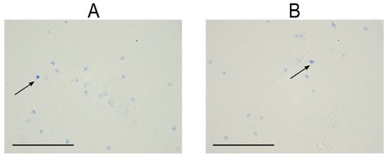 Representative microscopic image of sperm after aniline blue staining for assessment of sperm chromatin maturity of (A) normozoospermic men and (B) men with pathological semen parameters. Arrows indicate immature dark-blue stained sperm. Magnification 1000×, scale bar shows 50 µm.