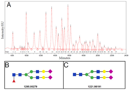 Structural characterization of glycans eluting in SPGP14 was performed by liquid chromatography-mass spectrometry (LC-MS). The identified glycans were with the composition H5N4F1S2 (m/z 1295.00279) and H5N4S2 (m/z 1221.98191) as the most abundant in the peak. These compositions would correspond to complex-type glycans biantennary digalactosylated disialylated glycan with (FA2G2S2) and without core fucose (A2G2S2), respectively (Figure 3B,C).