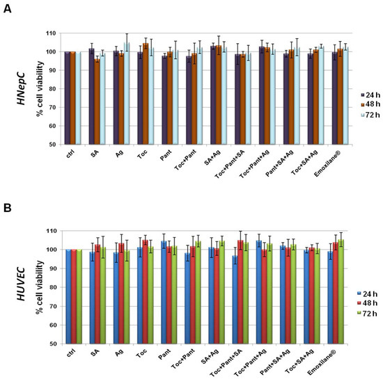 MTT assay was performed after HNEpC (A) and HUVEC (B) were treated for 24, 48, and 72 h with SA (200 µg/mL), Ag (30 µg/mL), Toc (40 µM), Pant (1% w/v), Toc+Pant, SA+Ag, Toc+Pant+SA, Toc+Pant+Ag, Pant+SA+Ag, Toc+SA+Ag, Toc+Pan+SA+Ag (Emoxilane®). Data are represented as mean ± SD. No statistically significant differences were determined.