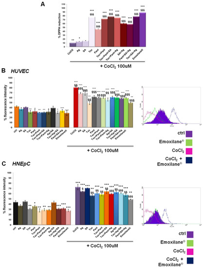(A) DPPH assay performed in presence of CoCl2 100 µM used as oxidant control. DCF-DA assay on HUVEC (B) and HNEpC (C) treated or not for 24 h with CoCl2 100 µM and 24 h more with SA (200 µg/mL), Ag (30 µg/mL), Toc (40 µM), Pant (1% w/v), Toc+Pant, SA+Ag, Toc+Pant+SA, Toc+Pant+Ag, Pant+SA+Ag, Toc+SA+Ag, Toc+Pan+SA+Ag (Emoxilane®). In both cases, representative flow histogram plots are reported for only cells treated or not with CoCl2 and then with Emoxilane® Data are represented as mean ± SD. * p < 0.05; ** p < 0.01; *** p < 0.001 vs. ctrl; § p < 0.05; §§ p < 0.01; §§§ p < 0.001 vs. CoCl2.