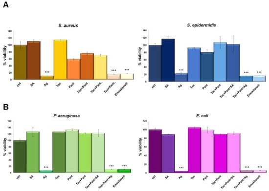 (A) S. aureus, S. epidermidis, E. coli and P. aeruginosa (B) were grown for 24 h in presence of the indicated test solutions: SA (200 µg/mL), Ag (30 µg/mL), Toc (40 µM), Pant (1% w/v), Toc+Pant, Toc+Pant+SA, Toc+Pant+Ag, Toc+Pan+SA+Ag (Emoxilane®). Bacterial cultures were measured at 600 nm and the results expressed as mean ± SD. *** p < 0.001 vs. ctrl.