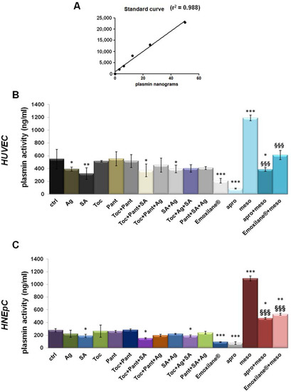 (A) Standard curve created from 0 ng to 75 ng in 50 µL of standard volume/well of plasmin concentration (standard enzyme provided by the manufacturer). Histograms representing the ng of plasmin in 50 µL of supernatant samples obtained from HUVEC (B) and HNEpC (C) cells treated or not with SA (200 µg/mL), Ag (30 µg/mL), Toc (40 µM), Pant (1% w/v), Toc+Pant, SA+Ag, Toc+Pant+SA, Toc+Pant+Ag, Pant+SA+Ag, Toc+SA+Ag, Toc+Pan+SA+Ag Emoxilane®). The association was tested also against mesoglycan 300 µg/mL for 24 h which was evaluated in presence or not of aprotinin 30 µM administered to supernatant samples 10 min before reading. (C) Western blotting of total protein extract from HUVEC treated or not with mesoglycan (300 μg/mL; 24 h), siRNAs against ANXA2 (100 nM; 48 h), and siANXA2s and mesoglycan (100 nM; 48 h and 300 μg/mL; 24 h, respectively). The data represent a mean of n = 3 independent experiments ± SD, * p < 0.05; ** p < 001; *** p < 0.001 vs. untreated control; §§§ p < 0.001 vs. mesoglycan treated cells.