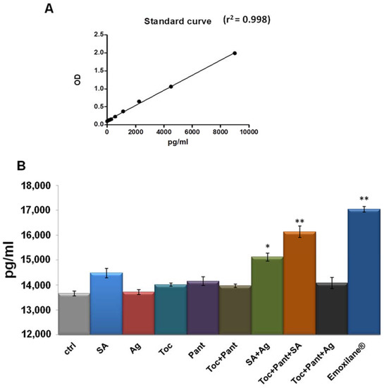 (A) Standard curve created from 0 pg to 9000 pg in 100 µL of standard volume/well of thrombin concentration (standard enzyme provided by the manufacturer). (B) Histogram representing the pg/mL of thrombin in 100 µL of human plasma samples. Treatments were performed with SA (200 µg/mL), Ag (30 µg/mL), Toc (40 µM), Pant (1% w/v), Toc+Pant, SA+Ag, Toc+Pant+SA, Toc+Pant+Ag, Toc+Pan+SA+Ag (Emoxilane®), with respect to not treated sample, for 2 min before incubation performed as indicated by kit manufacturer. The data represent a mean of n = 4 independent experiments ± SD, * p < 0.05; ** p < 001 vs. untreated control.