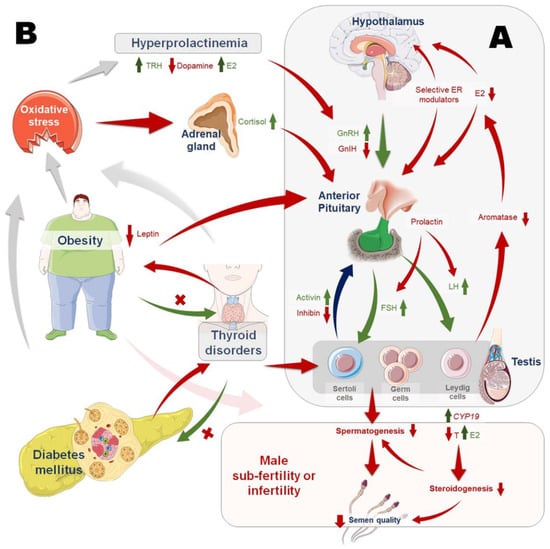 Endocrinopathies and male reproduction. (A) Neuroendocrine regulation by hypothalamic–pituitary–gonadal (HPG) axis maintains the normal secretion and functions of reproductive hormones. Gonadotropin-releasing hormone (GnRH) is synthesized by the hypothalamus, which stimulates the anterior pituitary to secrete the gonadotropins, luteinizing hormone (LH) and follicle-stimulating hormone (FSH). Whereas, gonadotropin-inhibitory hormone (GnIH) inhibits the anterior pituitary gonadotropin synthesis and release. In Leydig cells, LH acts to aid steroidogenesis. FSH acts on the Sertoli cells, supporting spermatogenesis. Sertoli cells secrete activin and inhibin among other substances, which mediate positive and negative feedback on the HPG axis, respectively. (B) Hormonal disturbances owing to endocrinopathies can impair hormonal crosstalk, thereby disrupting essential male reproductive functions. Upregulation of aromatase CYP19 (Cytochrome P450 Family 19) gene leads to a higher conversion rate of testosterone to estrogen, inducing estrogen excess, which in turn inhibits the HPG axis. Hyperprolactinemia is characterized by high serum prolactin levels that impede GnRH release from the hypothalamus, reducing gonadotropin secretion and perhaps inhibiting gonadotropin actions on the gonads. Endocrinopathies including obesity, thyroid hormone imbalance, and diabetes mellitus disrupt the intricate metabolic balance, elicit various metabolic hormones and inflammatory mediators, and may induce oxidative stress, all of which adversely affect the normal endocrine crosstalk regulating male reproductive functions.