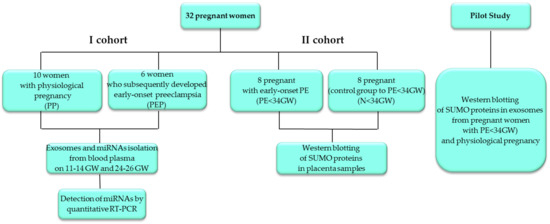 This study included pregnant women who were under observation at the National Medical Research Center for Obstetrics, Gynecology, and Perinatology named after Academician V.I. Kulakov of the Ministry of Healthcare of the Russian Federation. The total sample of patients of reproductive age consisted of 32 pregnant women, divided into 2 cohorts (Figure 1). The first cohort (cohort I) included 16 pregnant women. Plasma samples of peripheral blood were obtained from them at 11–14 and 24–26 weeks of pregnancy to evaluate the expression of exosomal miRNA. Early-onset PE, with a severe course in the third trimester of pregnancy, manifested in 6 of them. The second cohort (cohort II) included pregnant women with early-onset PE (8 women) and pregnant women of the control group (8 women) of the corresponding gestational age to evaluate the expression of SUMO proteins in placenta samples. This cohort of pregnant women was used in our previous study to evaluate the expression of oxygen-sensitive miRNA [41]. The clinical characteristics of pregnant women included in the study are presented in Table 1, Table 2 and Table 3. To evaluate the expression of SUMO proteins in exosomes, a pilot study was carried out in groups of pregnant women (7 with early-onset PE and 7 with physiological pregnancy).
