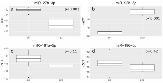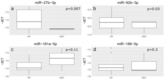Comparative analysis of the expression levels for miR-27b-3p (a), miR-92b-3p (b), miR-181a-5p (c), and miR-186-5p (d) in the exosomes of blood plasma from pregnant women at 11–14 GW. The box diagram shows the medians of −ΔCt values (relative quantification data), the first and third quartiles, the edges of the statistically significant sample, and the dots denote the emissions. PP is a physiological pregnancy. PEP is a pregnancy with preeclampsia-onset.