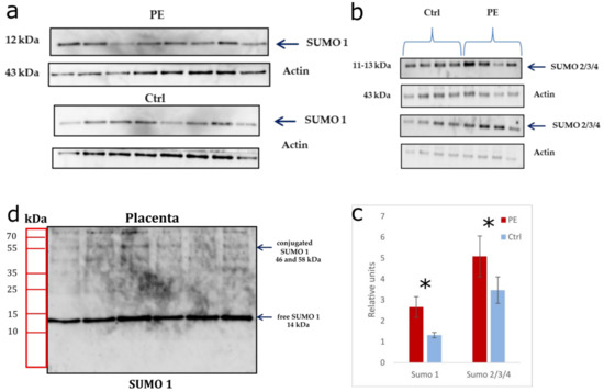 Considering that the sumoylation is involved in the formation of an adequate cellular response to hypoxia and the triggering of the signaling cascade of reactions, we estimated the expression of the SUMO 1 and SUMO 2/3/4 in the placenta in pregnant women with early-onset PE (cohort II) (Figure 5a,b). An increase in SUMO 1 (2.66 ± 0.49, p = 0.03) and SUMO 2/3/4 (5.08 ± 0.97, p = 0.01) was observed in PE compared with the control group of the corresponding gestational age (1.32 ± 0.12, p = 0.03; 3.47 ± 0.63, p = 0.01) (Figure 5c). It should be noted that SUMO 1 was present in the placenta, in both free (~14 kDa) and two conjugated forms (~46 kDa and ~58 kDa) (Figure 5d).