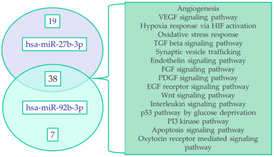 Taking into account the established correlations between miR-27b-3p and miR-92b-3p expression and the clinical data of pregnant women, we found it interesting to evaluate the participation of these miRNAs in signaling pathways. Using bioinformatics databases (MiRTarBase4.5, DAVID6.8, PANTHER14.1), we conducted a relevant search (Figure 6).