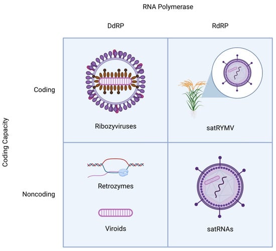 Schematic structures of distinct classes of viroid-like RNAs. All viroid-like agents are divided into four groups depending on whether they encode proteins and are replicated by DNA-dependent or RNA-dependent RNA polymerase. The satRNAs (lower right quadrant) are encapsidated by the helper virus capsid proteins. In one case (top right quadrant), a satRNA of rice yellow mottle virus (satRYMV) appears to encode a protein.