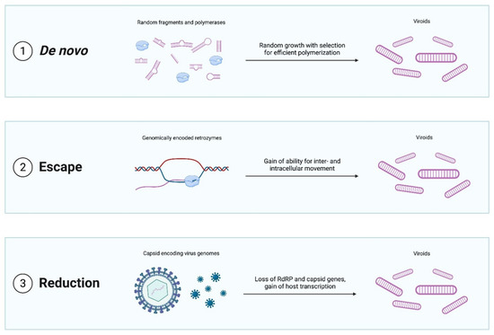 Evolutionary scenarios for the emergence of viroid-like replicators.