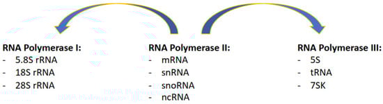 RNA Polymerase III (RNAPIII) transcribes transfer RNA (tRNA), with approximately 500 present in the human genome []; RNAPIII also transcribes the 5S rRNA that is arranged as a single cluster of approximately 100 repeats on chromosome 1 [], and the remaining of the snRNA and snoRNA.