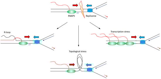 RNA polymerases complexes have molecular weights of more than 500 kDa even without accessory transcription factors, and as such, are much bigger than the physical barriers that replicative helicases can overcome on DNA []. Consequently, conflicts between the transcription and replication machinery create a particularly dangerous situation, as impediments to replication forks progression can induce an increase in DNA damage and genome instability (a condition generally referred to as replication stress) [,]. Indeed, studies in vitro and in vivo from bacteria to eukaryotes have shown how head-to-head collisions are more detrimental than codirectional ones in interfering with replication fork progression [,,,,,,]. Intriguingly, in the case of codirectional collisions, the replication machinery could take advantage of the mRNA present there to restart and continue replication after the collision site []. This finding is supported by in vivo data in bacteria with evidence of replication restart at codirectional collision sites []. However, an increase in codirectional collisions induced, for example, by an accumulation of backtracked RNAPII can be equally dangerous for genome stability, because the restart of replication downstream of the collision site can lead to an accumulation of single-strand gaps []. Altogether, these data indicate that a head-to-head or a codirectional collision between transcription and replication machinery could impact very differently on replication’s ability to progress with its task.