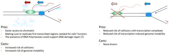 However, again analysing the evidence hypothetically, there are benefits for a cell in having the two processes coexisting. It would be easier to load and activate replication initiation complexes in the open chromatin conformation of transcribed regions (Figure 3) [,,,]. Moreover, even in case of DNA damage arising from a collision event, there is the potential direct positive impact and contribution of transcription and transcription-associated chromatin modifications to the DNA damage repair kinetics and repair pathway choices. For example, in the case of nucleotide excision repair, the DNA damage-affected RNAPII can directly recruit and activate the transcription-coupled nucleotide excision repair sub-pathway, with faster DNA damage repair kinetics in transcribed regions than in not transcribed regions [,]. In the case of double-strand breaks (DSBs), these are preferentially repaired by homologous recombination instead of non-homologous end joining in transcribed regions, with non-homologous end joining preferentially repairing DSBs in not transcribed regions [,]. Moreover, in recent years it has become evident that RNA polymerases and transcription play a direct role in the correct establishment of DNA damage repair and response foci and the repair of DSBs. More specifically, RNAs produced at DSBs sites are required for the correct assembly of 53BP1 foci and for the formation of a phase separation state, important for the activation of the DNA damage response [,,,]. DSB induced RNAs are MRE11-dependent and their processing requires the DROSHA and DICER RNases involved in RNA interference [,,]. An important step in this process is the generation of R-loops that facilitates the repair through RAD51-dependent homologous recombination, with many factors identified as important for R-loops establishment as well as R-loops resolution [,,,,,,,]. While currently, there is no evidence supporting that transcription could be directly involved in the resolution of transcription–replication collisions, a potential role for transcription cannot be completely excluded considering the above-mentioned data.