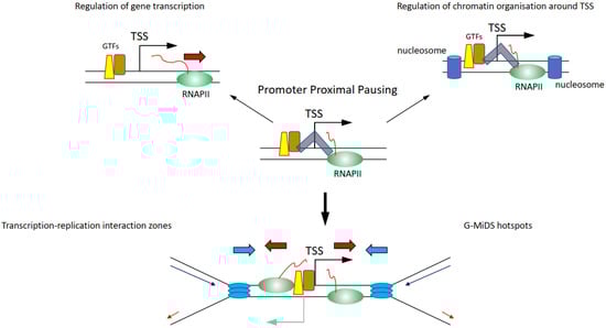 Whether components of the transcription machinery will remain on chromatin between ‘on’ bursts is not clear. If so, it is the promoter region that could represent a hotspot for high-risk transcription–replication conflicts, because of the high density of proteins present there (Figure 4) [,]. Among the proteins persisting at promoters, there is also the actual RNAPII, as the transition from initiation to elongation is a highly controlled process, meaning that even when RNAPII starts transcribing a gene, it can be halted at multiple points after the TSS. Promoter proximal pausing (PPP) halts the RNAPII 20–50 bp downstream of the TSS (Figure 4) []. This process was first identified on heat shock responsive genes and was proposed as a quick response mechanism to induce gene transcription following heat shock, simply by releasing the RNAPII from its promoter []. It was later found that PPP is a much more general transcription regulatory process controlled by CDK9 through the regulation of the NELF and the DSIF complexes [,]. Maintaining the RNAPII near the TSS through the PPP is moreover important to preserve the nucleosome organisation at TSSs, to protect the nucleosome-free region, and thus retain the ability to transcribe the gene (Figure 4) [,]. RNAPII is also controlled by CDK9 further downstream of the TSS and at the transcription termination site, although it is not clear what these regulatory steps are important for and whether they affect the replication of genes [,]. Intriguingly, knockdown of components of the NELF and DSIF complexes important to regulate PPP reduces RNAPII persistence at TSSs and G-MiDS frequency and levels, linking RNAPII occupancy at TSS to late cell cycle DNA synthesis (Figure 4) []. These data support that TSS surroundings are the hotspot sites where the transcription and replication machinery interact together and identify TSSs as the regions where to seek answers on how transcription and replication coordination takes place (Figure 4) [].