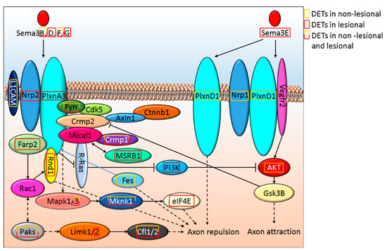 Sema6A and 6D gene expression is affected in lesions that share receptors of Sema3A, as well as CSPG, the receptor of Sema5A. These alterations may also affect axon repulsion. The schematic in silico model of the potential crosstalk between Sema3-Sema4-Sema5-Sema6 signaling is shown in Supplementary Figure S1 and Table S1P, while Supplementary Figure S2 and Table S1Q shows the interaction of Sema4 and Sema7A signaling, which only affected in L samples.