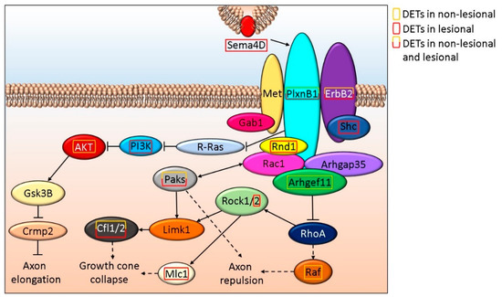 Sema4D is important in axon regeneration not only by modulating axon elongation but also by inhibiting neuron myelination [61]. SEMA4D encoding DETs are present in L but not in NL skin. Sema4D cell surface receptors (PlxnD1 and ErbB2), as well as downstream signaling proteins (Paks, Cfl1, and Cfl29) expression are altered in NL and L skin. Whereas in NL skin, AKT, Arhgef11, and RAF, while in L samples Mlc1, PI3K, Rnd1, Rock2, and Shc are affected by DETs (Figure 2 and Supplementary Table S1O).