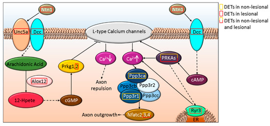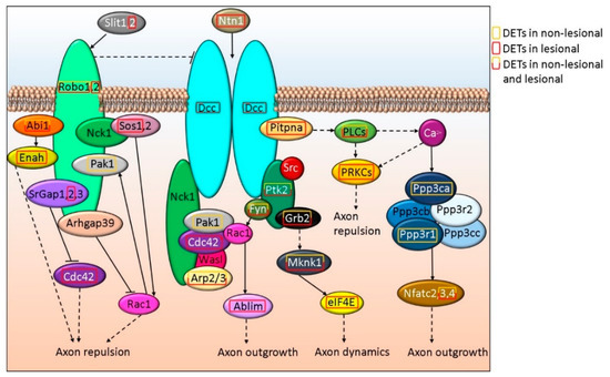 Axon dynamics is also regulated through Slit and Ntn signaling via Robo and Dcc, respectively. Slit and Ntn signaling via Robo and Dcc were found as part of the general canonical signaling pathway term Axonal Guidance Signaling that also included Wnt5a and semaphorins and were suggested to be affected both in NL and Lesional skin (p-valueNL vs. H = 3.21E-5 and p-valueL vs. H = 5.03E-06, respectively). SLIT2 and its receptor ROBO2 are affected only in L skin, while ROBO1 expression is altered in NL and L samples (Figure 3 and Supplementary Table S1R). The expression of NTN1, as well as its receptors DCC (Figure 3) and UNC5A (Figure 4 and Supplementary Table S1S) are affected in L but not in NL skin, where only some of the downstream proteins may be differentially expressed.