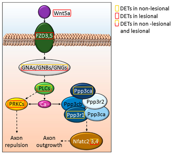 We found that WNT5A is affected in psoriatic lesions, and the FZD3 and FZD5 receptor-mediated (also affected in L skin) signaling pathway may play a role in axon growth/repulsion (Figure 5 and Supplementary Table S1T). In contrast, we only found DETs of downstream molecules in the NL skin, and these were mostly affecting axon outgrowth (Figure 5.).