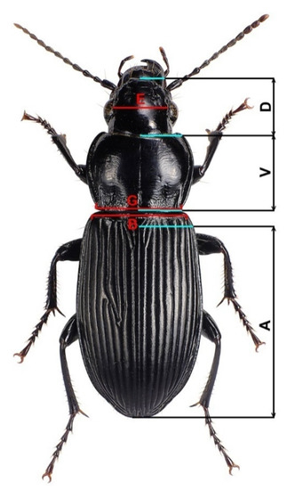 Placement of morphometric measurements. A—Elytra length as distance between posterior end of scutellum and terminus of right elytron (in the case of absence of intact right elytron, left one is acceptable). B—Elytra width as distance between anterior-distal corners of elytra. V—Pronotum length measured along of central furrow. G—Pronotum width as distance between posterior corners of the pronotum. D—Head length as distance between labrum and juncture of occiput and postgena. E—Head width as distance between proximal innermost sides of eyes. Measured sample size is presented in Table 1.
