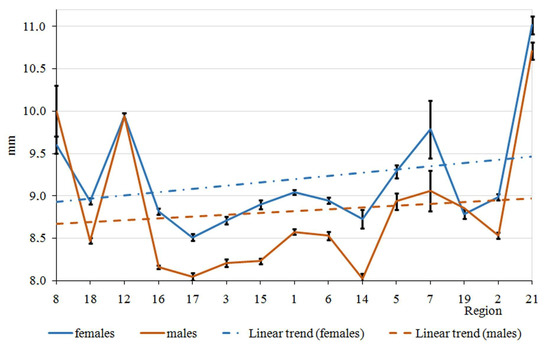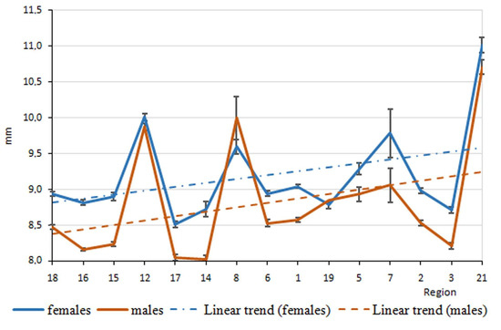 The elytra length variation in P. melanarius by latitude gradient was sawtooth (Figure 3); trait values sharply changed between the 8th and 16th regions, situated within 5° in latitude. A relatively smooth curve between 51° and 57° (the regions designated as 16, 17, 3, 15, 1, 6, 14 on the horizontal axes) gave way to a sharp rise in the trait values in the populations at the regions practically at the same latitude (regions 5, 7). Then, elytra length decreased again and sharply increased in the most northern region (21). The longitude gradient in elytra length variation was no less dramatic (Figure 4). However, the trends of trait increase were statistically significant in both gradients (Table 2 and Table 3). In addition, they did not differ in males and females (Figure 5 and Figure 6). It was common for both gradients that males were smaller than females (excluding populations of P. melanarius in 3 studied regions out of 15).