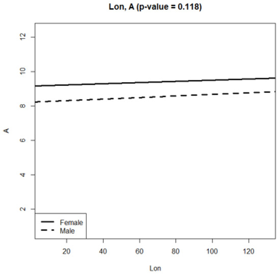 The ak,0 coefficient is the model intercept for females, the ak,1 coefficient is a correction to it for males, ak,2 is the slope of the regression for females, and ak,3 is an amendment to it for males, which allows us to estimate the sexual dimorphism in the dependence of size on geographic coordinates and its significance.
