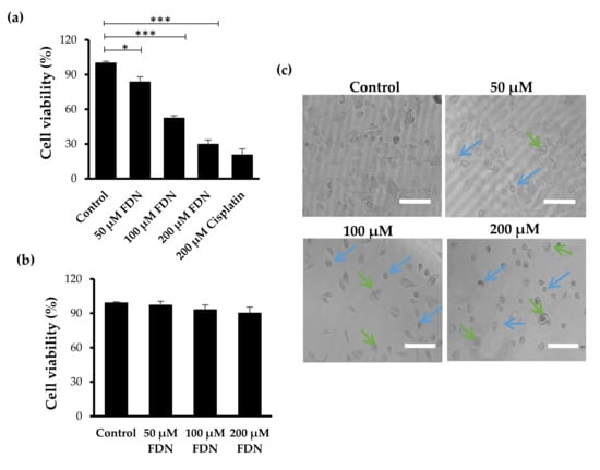 FDN mediated toxic effects on (a) NSCLC A549 cells and (b) J774A.1 cells as established through MTT assay. (c) Phase-contrast images of FDN-treated A549 cells for 24 h, instigating morphological aberrations where swelling and cell membrane lysis within FDN-treated A549 cells are indicated by green and blue arrows (scale bar 100 µm). * p < 0.05, *** p < 0.001 vs. control.