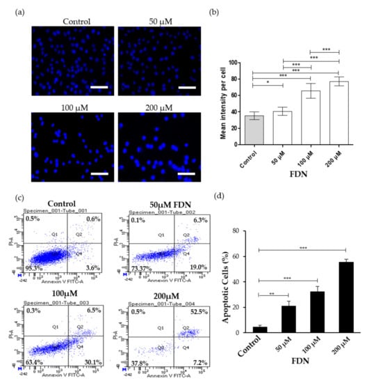 (a) Condensation and fragmentation of nucleus post-FDN exposure (scale bar 100 µm); (b) signal intensity of Hoechst-33342 staining. The mean signal intensities were determined for at least 25 cells from each preparation and control using image J program. (c) FDN induced apoptosis in lung cancer cells as assessed by Annexin-V FITC/PI assay. (d) Percent total apoptosis in FDN-treated lung cancer cells normalized to the number of untreated cells. * p < 0.05, ** p < 0.01, *** p < 0.001 vs. control.