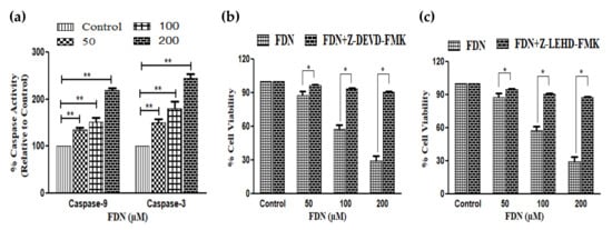 (a) Effect of FDN on caspase-3 and -9 activities. Cellular viability of NSCLC A549 cells pre-exposed to inhibitors of (b) caspase-3 and (c) caspase-9. * p < 0.05, ** p < 0.01 vs. control.