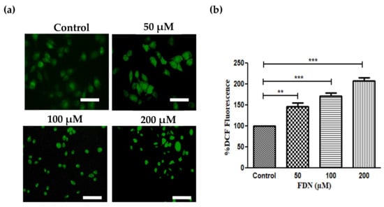Intracellular ROS generation post-FDN exposure assessed (a) qualitatively (scale bar 100 µm) and (b) quantitatively using DCFH-DA staining. ** p < 0.01, *** p < 0.001 vs. control.