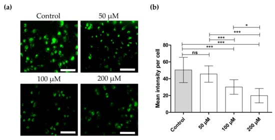 The efficacy of FDN in instigating levels of ROS within NSCLC A549 cells was assessed through DCFH-DA stain as per the protocol described earlier [12]. For qualitative assessment, 2 × 104 A549 cells/well were treated with 50, 100, and 200 µM of FDN and, at 12 h post-incubation, cells were stained by DCFH-DA (10 µM; 30 min at room temperature). Finally, the cells were visualized and the photomicrographs were captured through the green filter of FLoid Imaging Station (Thermo-Scientific, Waltham, MA, USA).