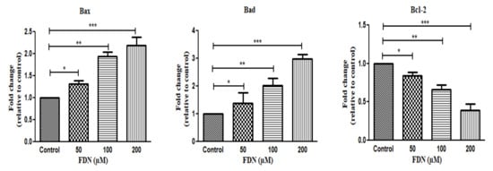 Competency of FDN in inducing the alterations within expression of pro- and antiapoptotic genes as evaluated through RT-PCR. * p < 0.05, ** p < 0.01, *** p < 0.001 vs. control.