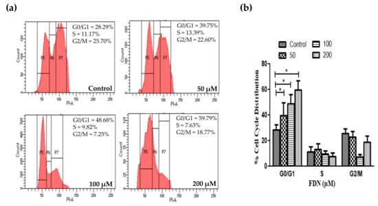 The effect of FDN treatment on cell cycle progression of A549 lung cancer cells. (a) Cell cycle analysis by flow cytometry of A549 cells treated with FDN (50-200 μM) for 24 h. (P5 = G0/G1, P6 = S and P7 = G2/M). (b) Quantitative data from three independent experiments. * p < 0.05 vs. control.