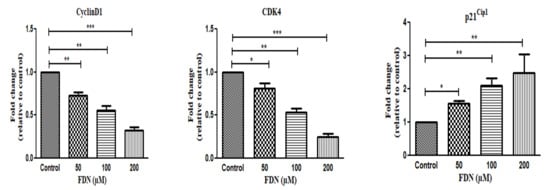 Generally, the cell cycle is regulated in part by cyclins and their associated cyclin-dependent kinases (CDKs) [20]. Therefore, to gain further insight on the impact of FDN on cell cycle progression, the effect of FDN on cell cycle-associated genes, such as cyclinD1, CDK4, and p21Cip1 genes, was investigated. As shown in Figure 8, FDN exposure resulted in a dose-dependent decline in the expression level of both cyclinD1 and CDK4 genes, which play a crucial role in cell progression through the G1 phase, compared to untreated cells. Treatment with FDN resulted in a significant decrease in cyclin D1 expression levels, respectively, compared to untreated cells. Similarly, treatment with 50, 100, and 200 µM of FDN triggered a dose-dependent reduction in CDK4 expression levels, respectively, compared to untreated cells. On the other hand, FDN exposure substantially elevated the expression levels of the cell cycle inhibitor, p21Cip1, compared to untreated cells (Figure 8). Collectively, our results indicate that FDN could trigger cell cycle arrest via alleviating the expression levels of cyclinD1 and CDK4 genes, while elevating the expression of cell cycle inhibitor, p21Cip1.