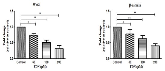 Effect of FDN on mRNA expression of genes involved in the Wnt signaling pathway. Fold change in mRNA expression level relative to the control of Wnt3 and β-catenin was analyzed quantitatively through RT-PCR. * p < 0.05, ** p < 0.01 vs. control.