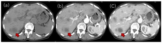 (a) Plain CT. Multiple low-attenuation areas were detected; (b,c) contrast-enhanced CT revealed multiple low-attenuation areas with mild peripheral enhancements at the arterial (b) and portal phases (c). A typical tumor is shown with an arrow in each panel.