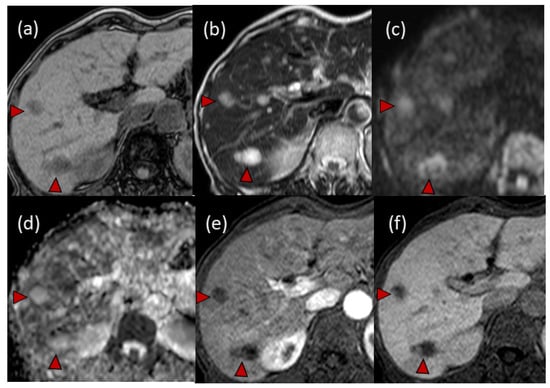 Findings of magnetic resonance imaging (MRI): (a) hypo-intensity lesions on T1-weighted imaging; (b) high-intensity masses on T2-weighted imaging; (c) high-intensity lesions on diffusion-weighted imaging (DWI); (d) high values on apparent diffusion coefficient (ADC) maps. In the dynamic gadolinium ethoxybenzyl diethylenetriamine pentaacetic acid-enhanced MRI (EOB-MRI), multiple masses were detected as hypo-intensity lesions both in the early phase (e) and hepatobiliary phase (f). Typical tumors are indicated with arrowheads.