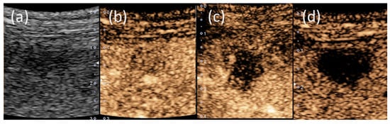 Findings of ultrasonography (US): (a) a hypoechoic tumor of 10 mm in size was observed (Aplio; Canon Medical Systems, Japan). On Sonazoid contrast-enhanced US, the tumor showed very slight hypoenhancement in the arterial phase (b), washout with peripheral enhancement in the portal phase (c) and hypointensity in the Kupffer phase (d).