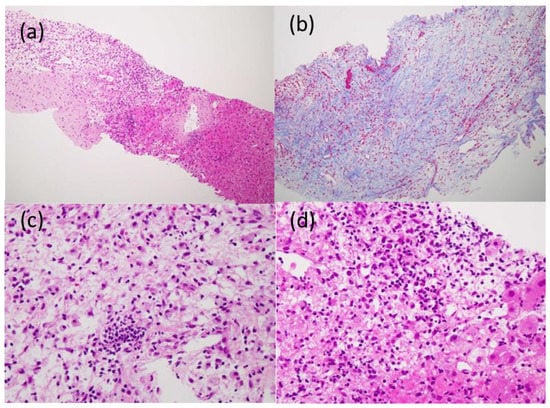 Histological findings obtained by the US-guided needle biopsy: shedding of liver cells, edematous changes and fibrosis with the infiltration of inflammatory cells, including lymphocytes and macrophages, were observed; (a) Hematoxylin and Eosin (HE) staining (×4); (b) Azan staining (×10); (c,d) HE staining (×20).